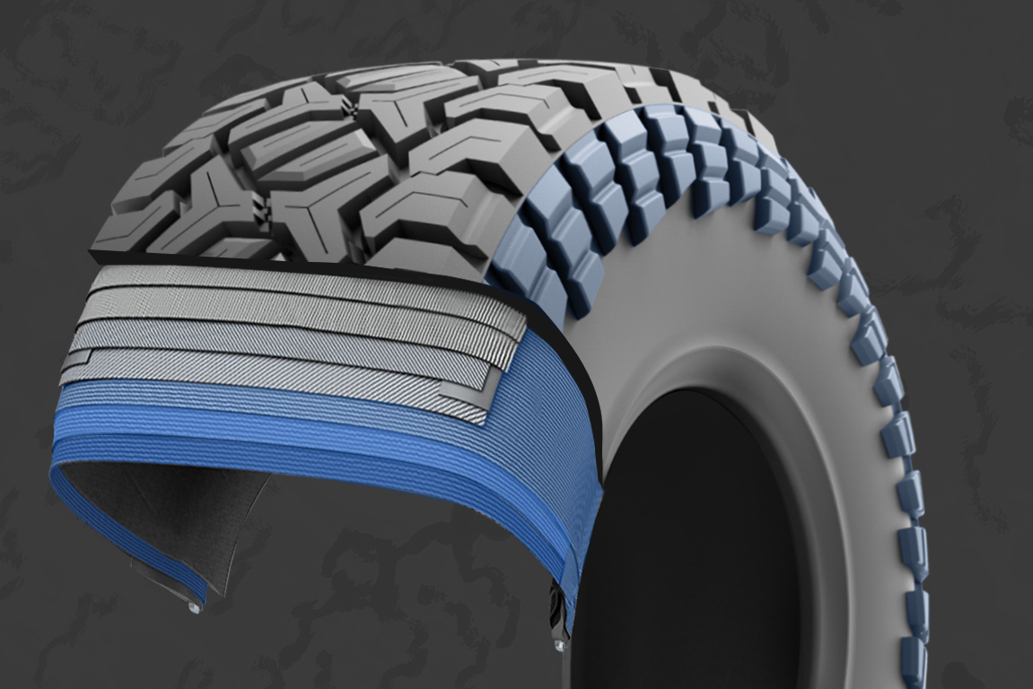 A 3-Ply internal structure significantly boosts sidewall rigidity. Robust sidewall blocks, contiguous to the tread, provide superior protection for the tire carcass.