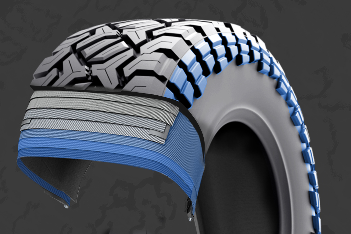 A 3-Ply internal structure significantly boosts sidewall rigidity. Robust sidewall blocks, contiguous to the tread, provide superior protection for the tire carcass.